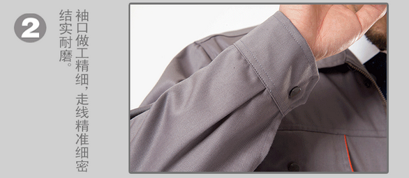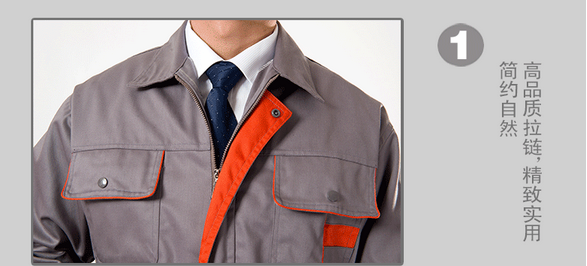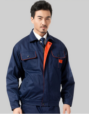 JL-QD248東莞工衣以藏藍色為主色,胸前采用橘色搭配,醒目,工業(yè)感強。前兜簡單,走線細致,實用性強。左中腰間口袋均采用雙層設(shè)計,傾斜線條,穩(wěn)重大氣 。