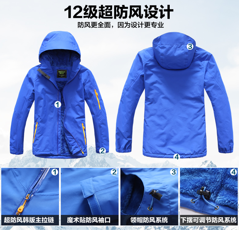 面料采用專業防水面料,選用380g復合長毛絨。衣服雙側口袋,滿足不同身材,不松不緊,穿著舒適。接縫全壓膠,防水透氣達到專業級別;